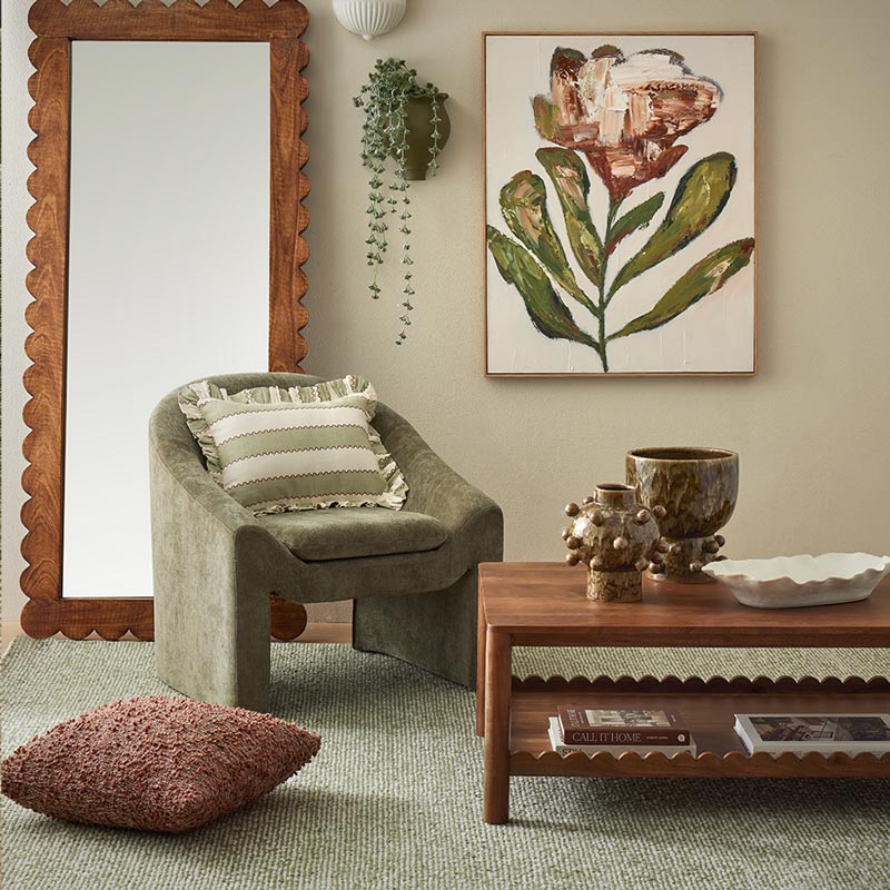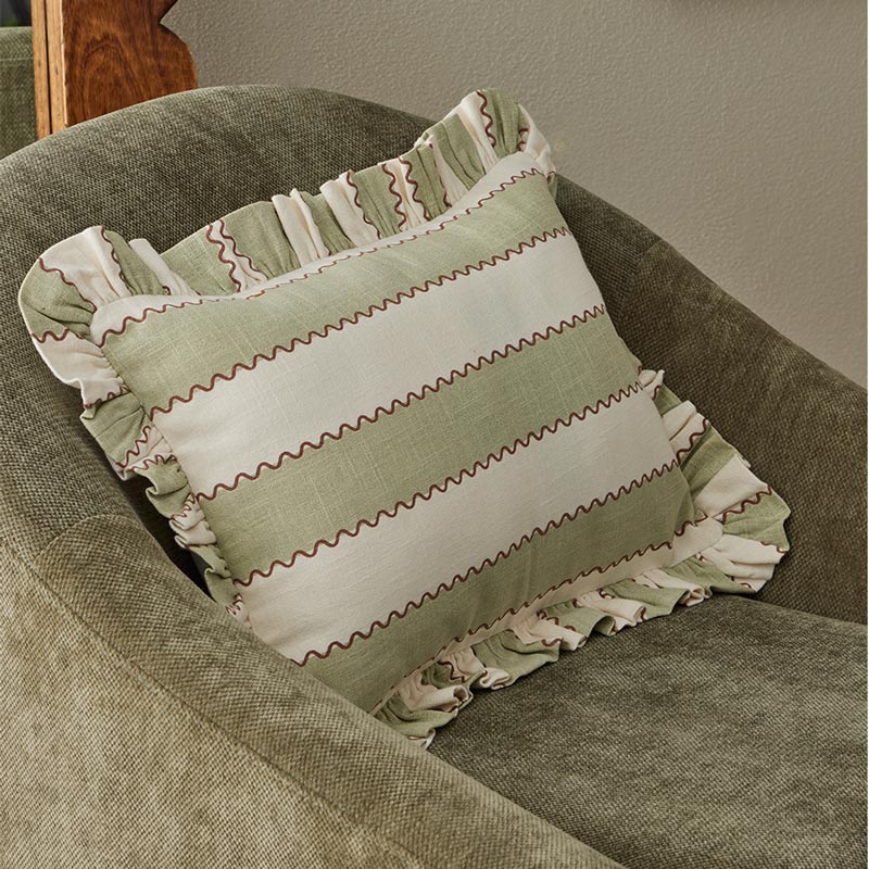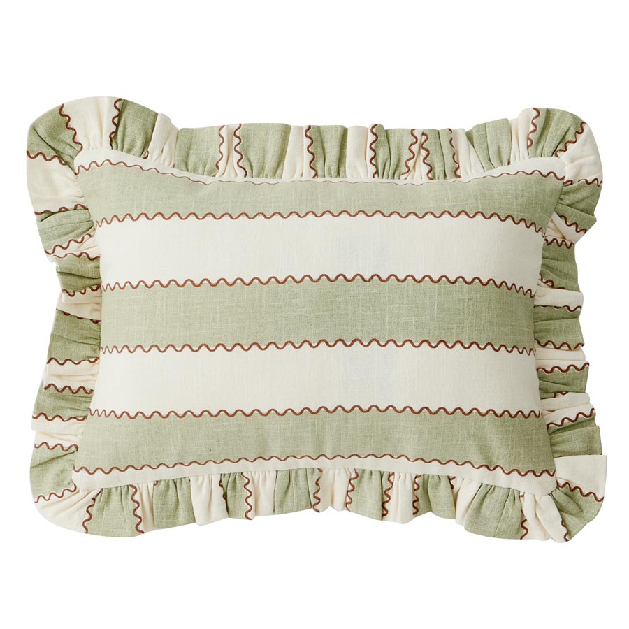This rectangular cotton cushion showcases a pistachio stripe complemented by a terracotta squiggle accent, while its distinctive ruffled edge adds textural interest.