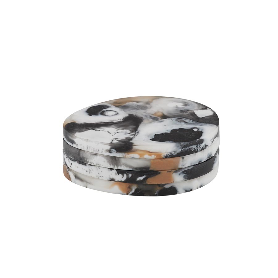 A unique set of four resin coasters featuring distinctive patterns that combine aesthetic appeal with practical functionality.